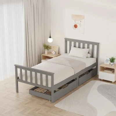 General description This WestWood Wood Single Bed Frame is designed for both kids and adults, featuring two pull-out storage drawers that help keep your room organized by storing bedding, toys, or clothes. Made from durable solid pine wood and MDF, this bed frame provides reliable support for daily sleeping routines. Its classic slatted headboard allows it to fit seamlessly into various bedroom styles, from children's rooms to modern minimalist interiors. Designed to accommodate a standard single mattress (not included), this bed frame maximizes floor space while maintaining a clean aesthetic. Technical specifications Model: BW03 Material: Solid Pine Wood + MDF Colour Options: Grey Overall Dimensions: 198cm (L) x 98cm (W) x 82cm (H) Footboard Height: 62cm Drawer Dimensions: 91cm (L) x 62cm (W) x 17.5cm (H) Max Weight Capacity: 100kg Carton Size: 1050mm x 420mm x 195mm Net Weight: 21kg Gross Weight: 23kg Other information PLEASE NOTE: NO MATTRESS INCLUDED.