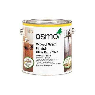 General description Osmo Wood Wax Finish Clear Extra Thin is a natural oil and wax combined interior finish specifically designed for ingredient-rich hardwoods such as Teak, Cedar, Iroko, and Walnut. This product provides a rich professional satin finish in a single application, accentuating the grain and texture of the wood. It is extremely water-resistant and dirt-repellent, making it suitable for various interior uses including flooring, furniture, and joinery, even in wet rooms, kitchens, and bathrooms, without suffering from water marks. This all-in-one product requires no base coat, primer, or top coat. Technical specifications Coverage: 20m²/L with one coat Number of coats: 2 coats recommended Application temperature: +5°C Drying time: 12 hours Available sizes: 0.125L, 0.750L, 2.5L Usage Penetrates deeply to protect against wear, dirt, and moisture Resistant to common liquid spillages such as water, juice, tea, cola, and wine No primer necessary, even in bathrooms or kitchens