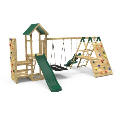 General description This impressive Rebo climbing frame features a vertical climbing wall, an up & over wall, and a second slide platform on the end of the swing arm, making it one of the most remarkable models in Rebo’s extensive wooden climbing frame catalogue. Made from pressure-treated timber, these sturdy climbing frames are built to last and will provide years of joy while promoting fitness and healthy play for children. Technical specifications Material: Pressure-treated timber Slide height: 8 ft Slide material: Durable injection-moulded plastic Installation Tools required: Drill Wood is not pre-drilled; full instructions are provided Canvas needs to be cut to size for the roof as part of the assembly