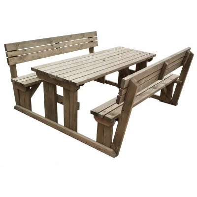 ManoManoGeneral description The 8ft (240cm) Picnic Table and Bench Set with Backrest features a rustic brown finish and is designed for comfort and durability. Made from heavy-duty pressure-treated timber, this set is perfect for outdoor gatherings, providing a homely atmosphere while being functional. Technical specifications Table Height: 730mm Table Width: 700mm Bench Height: 465mm Bench Width: 265mm Overall Length: 1500mm Timber Dimensions: 89mm x 38mm (4 x 2) Available finishes: Rustic brown and light green (natural) All fixings are corrosion resistant Timber sourced from responsibly managed forests Installation The picnic table and bench set is supplied in knockdown form for easy on-site assembly. It requires only a socket set and screwdriver (preferably battery-operated) for assembly. Instructions will be included with the delivery, and assembly videos are available for your convenience. Usage This picnic table and bench set is ideal for outdoor dining, gatherings, and relaxation. The