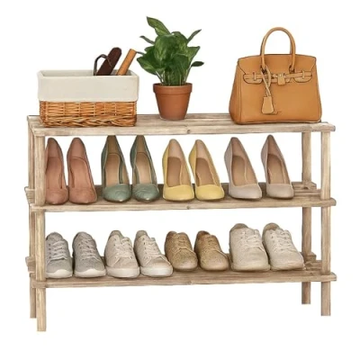 ✔️ DURABLE - Easy and quick assembly, no tools required. 3 Tier - W74cm x H48.5cm x D26.5cm, Ideal space saving storage solution. Robust durable wooden construction ✔️ SIMPLE DESIGN - Find a new home for your shoes and trainers with this sleek, minimalist shoe holder! Its simple design makes it fit aesthetically in both modern and traditional rooms. At the same time, this hallway or living room storage rack may help make sure that your footwear is always safe and clean. ✔️ SPACE SAVING - The shoe stand is narrow enough so that you won't have difficulty walking around at home. The space-saving narrow shoe rack is a great option for homes with tight spaces such as condos and apartments. If you have more shoes than a single rack can contain, make more room by getting two or more and stacking them up! ✔️ HIGH QUALITY MATERIALS - Find shoes storage solutions that are built to last. Each shoe tray or boot tray is made of natural Chinese fir wood, which is known to be lightweight and durable. You may change its place or position easily with little to no effort. It may also stay in its prime even after thorough use, thanks to the wood’s sturdiness. The wooden shelves will not deform easily despite carrying the weight of your kicks. The material may also be less likely to get damaged by rot. ✔️ STYLISH - Make your most precious collectibles shine when you display them on a rack. More than a shoe shelf, this wooden shelving unit may also be used for other household items. Use this as a tool rack in the shed or garage, or as garden or greenhouse shelving. Use them as cupboard shelves or for toys, books, and souvenirs. The open design is also suitable for clothes or wardrobe storage. Do note that the shelves are slatted, so thin items may fall through the slats. ✔️ QUICK ASSEMBLY - Assemble the hallway storage rack for shoes without breaking a sweat. The instructions are easy to follow, and the tools you need are already included. You don't even need help! Do it yourself and follow the instructions as closely as possible to help prevent any issues like unstable construction. Cleaning is also simple because all you need is a soft piece of cloth to wipe down the surfaces. Avoid using abrasive cleaners because that may damage the wood.