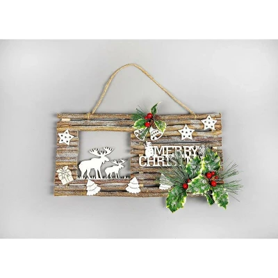 Wooden Twig Frame Plaque Sign Christmas Reindeer Scene Merry Wall Hanging Decoration with Pine Cones, Red Berries, Glittery Leaves, and Festive Elements Door Xmas Home Decorative Gift
