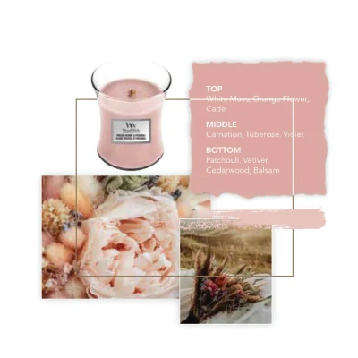 About This Fragrance Delicate floral scents bloom on a bed of woody vetiver and patchouli aromas. Fragrance Notes: White Moss, Orange Flower, Cade. Carnation, Tuberose, Violet. Patchouli, Vetiver, Cedarwood, Balsam About Large Jar Candles Large Hourglass Woodwick Candles complements your home with a soft crackle and inviting scents. The patented PLUSWICK technology in this Large Hourglass Candles features a natural wooden wick that is designed to Crackle as it Burns. Featuring our recognisable hourglass shape, and available in a wide range of fragrances, these candles help take your home decor to a new level. Each Large Hourglass Candle is 10.2cm x 10.2cm x 17.8cm Burn Time Up To 180 Hours.
