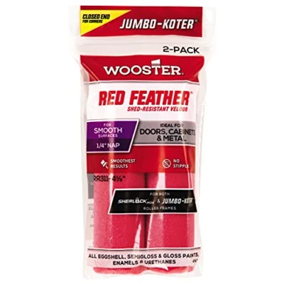General description The Wooster Jumbo-Koter Red Feather 4.5" Mini Roller Sleeves are premium roller sleeves designed for achieving a feather-smooth, professional finish. They are ideal for use on doors and cabinets, making them perfect for gloss paints, undercoats, eggshells, semi-gloss, varnishes, and enamels. Technical specifications Size: 4.5 inches Nap: 1/4 inch Type: Velour roller sleeve Recommended Use: Gloss paint, eggshell paint, semi-gloss paint, varnishes, and enamels Compatibility and accessories Compatible with Wooster Jumbo Koter Shergrip Mini Frame Compatible with Wooster Jumbo Koter Mini Flip Frame Usage Ideal for achieving a feather-smooth finish on smooth surfaces Closed ends save time when painting corners
