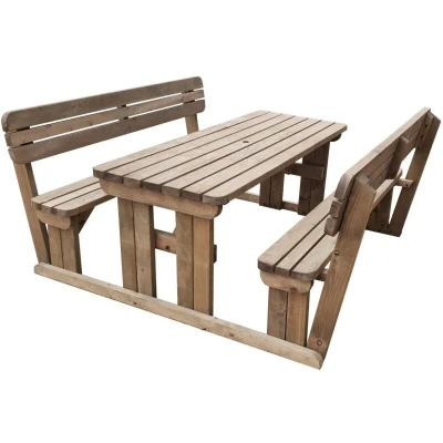 General description At Arbor Garden Solutions, we champion wooden outdoor furniture as an affordable and sustainable way to enhance your outdoor space. Our 4ft (120cm) picnic table and bench set features a rustic brown finish and rounded corners, making it a perfect addition for both relaxation and functionality. Each bench is designed with back support for increased comfort, and the set is made from heavy-duty pressure-treated timber sourced from responsibly managed forests. Technical specifications Table Height: 730mm Table Width: 700mm Bench Height: 465mm Bench Width: 265mm Overall Length: 1500mm Timber Dimensions: 89mm x 38mm (4 x 2) All fixings are corrosion resistant Available finishes: Rustic brown and light green (natural) Installation The picnic table is supplied in knockdown form for easy on-site assembly, allowing for convenient access to the location. Assembly requires a screwdriver (preferably battery-operated) and a 10mm socket head. Assembly instructions will be