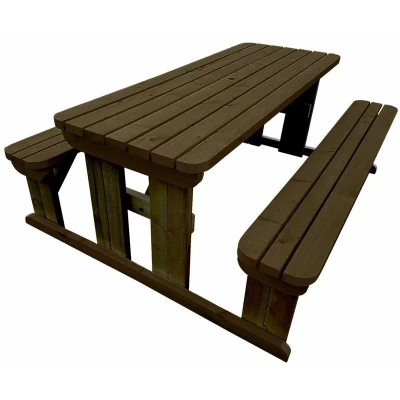 General description At Arbor Garden Solutions, we champion wooden outdoor furniture as an affordable and sustainable way to enhance your outdoor space. Our 5ft (150cm) picnic table and bench set, featuring a rustic brown finish and rounded corners, is designed for both relaxation and functionality. Each bench is supplied in knockdown form for easy on-site assembly, allowing for convenient access to your location. Technical specifications Table Height: 730mm Table Width: 700mm Bench Height: 465mm Bench Width: 265mm Material: Heavy-duty pressure treated timber (89mm x 38mm / 4 x 2) All visible bolts have black cover caps for safety and aesthetics Corrosion-resistant fixings Available finishes: Rustic brown and light green (natural) Timber sourced from responsibly managed forests Installation Easy to assemble with a socket set and screwdriver (preferably battery-operated) Assembly instructions included with the 24-hour notification email Assembly video available for convenience Usage