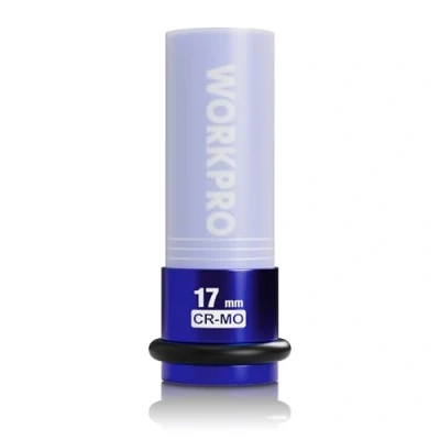JoybuyThe WORKPRO 1/2" Drive 17mm Impact Socket is made of premium CR-MO steel with a protective design to prevent wheel and nut damage, featuring color-coded, laser-etched size markings, dual-compatible drive, and an extended length for efficient and safe lug nut removal or installation during car repair.