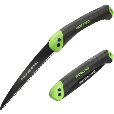 The WORKPRO Handsaw Pruning Saw is a foldable, multifunctional saw featuring a sharp bi-metal blade, adjustable cutting angle, and ergonomic TPR handle—ideal for garden, wood, and outdoor use. Its secure locking system and compact design make it portable and safe for all pruning and woodcutting tasks.