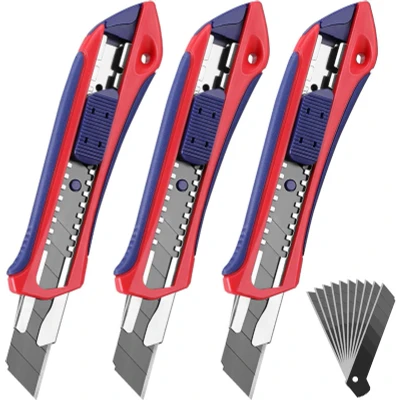 The WORKPRO Set of 3 Cutter Knife Set features professional 18 mm SK5 carbon steel blades with ergonomic rubber handles, secure blade locking, and includes 10 replacement blades—ideal for cutting paper, cardboard, crafts, and more with lasting sharpness and safety.