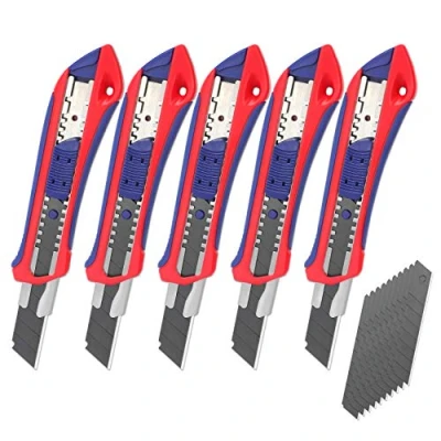 HIGH-QUALITY MATERIAL – High-quality SK5 blade with extended service life and permanently sharp cut. Blade thickness: 0.5 mm. SAFE & EASY TO USE – Blade locking system ensures safe work without risk of injury. You can always get a brand-new sharp blade by simply removing or snapping off the old one to keep the blade sharp. COMFORTABLE HANDLE – The ergonomic handle is made of ABS + TPR rubber, making it soft and comfortable, so you won’t feel tired during use. SMALL & RETRACTABLE – The snap-off blade is 18 mm wide, utility knife length: 160 mm, all knives are compact. Small enough to fit comfortably in hand or be carried around. Versatile Use & Delivery – This carton knife is suitable for cutting paper, tape, cardboard, photos, crafts, vouchers, fabrics, foam boards, mats, softwood, or postal packages. The package includes 5 utility/carpet knives and 20 additional replacement blades.