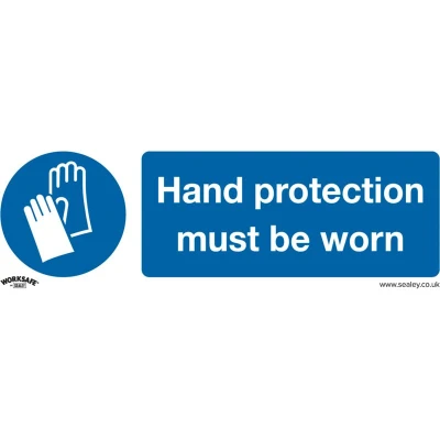 General description Sealey Worksafe® Hand Protection Must Be Worn Safety Sign is a mandatory safety sign made from self-adhesive vinyl. It measures 300 x 100mm and is designed to ensure that hand protection is worn in various environments. Technical specifications Material: Self-Adhesive Vinyl Dimensions: 300 x 100mm Pack of: 10 Model No.: SS6V10 Compatibility and accessories Suitable for use in office, workshop, and all other commercial and retail environments. Other information