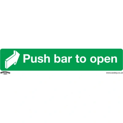 ManoManoGeneral description Sealey Worksafe® Push Bar To Open Safety Sign is a self-adhesive vinyl sign designed for easy application in various environments. This pack includes 10 signs, making it ideal for offices, workshops, and other commercial or retail settings. Technical specifications Material: Self-adhesive vinyl Dimensions: 300 x 70 mm Model No.: SS29V10 EAN: 5054630001369 Other information