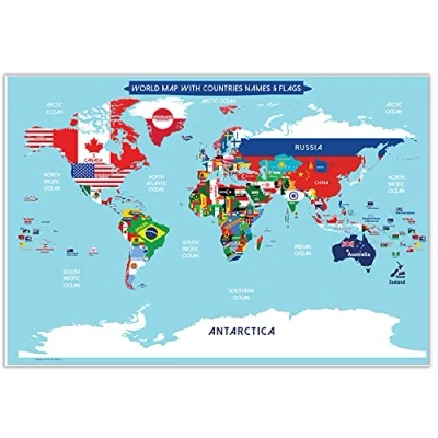World Map Poster with Countries FLAGS for Kids (Small size13x19 Laminated) Perfect wall School classroom or home