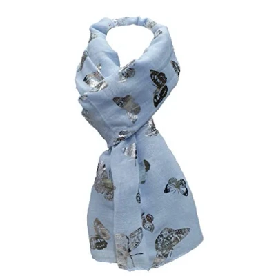 World of shawls New Butterfly Print Ladies Celebrity Style Scarves Maxi, Scarf, Wrap, Sarong, (Baby Blue With Silver Foil Butterfly)