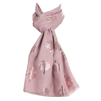 World of Shawls Silver Foil Mulberry Tree Print Fashion Scarf (Dusky Pink With Tree)