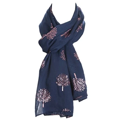 World of Shawls Silver Foil Mulberry Tree Print Fashion Scarf (Navy Blue With Pink Tree)