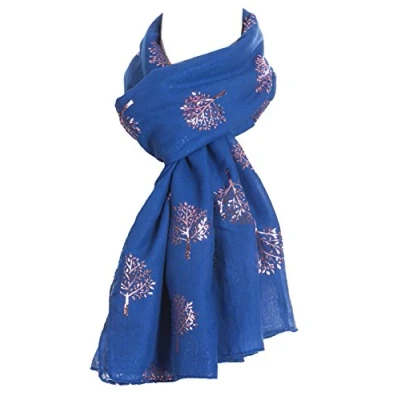World of Shawls Silver Foil Mulberry Tree Print Fashion Scarf (Royal Blue With Pink Tree)