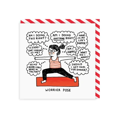 Worrier Pose Square Greeting Card (899) Sun salutation? More like anxious meltdown! Gemma Correll’s comedic take on yoga gives a gentle jab at life’s stress—send to a friend who “omms” ironically.