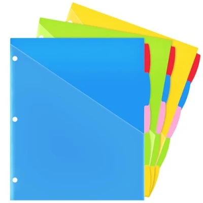 Instant Visibility & Generous Storage: Each tab divider features a crystal-clear front pocket for effortless browsing and organizing loose papers, receipts, or notes. while the ergonomic slanted design resists slips and moisture damage during document handling—crafted from tear-resistant poly material for daily durability in office, school, or home organization systems. Precision Organization, Effortless Access: Designed with 1/5-cut reinforced tabs and writable blank labels, our 3 ring binder dividers let you customize tabs for instant access to notes, documents, or projects. Streamline workflows in classrooms, offices, or hybrid spaces with intuitive indexing and tear-resistant durability. Boost Focus & Joy: Five lively hues (pink, blue, yellow, red, green) act as your workspace’s vibrant companions, turning cluttered files into eye-catching landmarks while sparking joy through playful contrasts. Crafted for instant recognition, they align with universal color psychology—red shouts urgency, blue whispers calm, yellow radiates energy, pink softens stress, and green for renewal—to streamline tasks and lift moods effortlessly. Fits 3 Ring Binders: WOT I binder dividers with pockets are perfectly fit for standard 3 ring binder. Come with 5-tab set, pack of 3 Sets, totally 15 tabs. Wide Applications: WOT I binder dividers with tabs, built with heavy-duty plastic, stand up to daily wear and tear - ideal for keeping school notes tidy, managing office documents, or sorting creative project materials. These Tab dividers simplify any task while lasting through constant use.