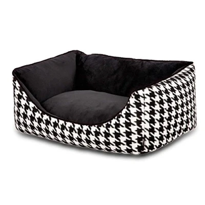 Sofa for dog comfortable and unique for a deep sleep Hounds tooth fabric and black fluffy fabric in 100% polyester Piping in black satin fabric