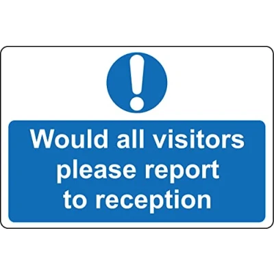 Would all visitors please report to reception sign 1mm Plastic sign Digitally printed for extra durability Drill and screw in position or use double sided tape to mount onto suitable surface.