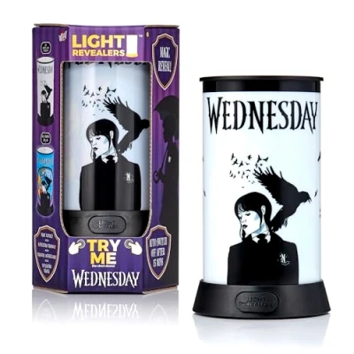 Fan-favourite character illuminate your room with the wednesday light revealers lamp - the excellent night light for kids and adults who are fans of wednesday addams 360° Magic light-up scene press the button to reveal a glowing 360° scene featuring the iconic nevermore academy dormitory window Auto-off night light features a calming glow and auto shut-off after 15 minutes - great for relaxing and falling asleep Portable & stylish design lightweight and cable-free, this lamp is excellent for desks, bedside tables, or anywhere you want a touch of gothic charm Battery or usb powered choose between usb power, cable not included, or 3x aa batteries, included, for use anywhere in your home