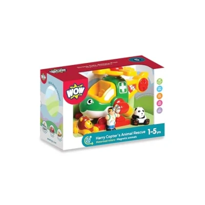 Trigger activated, motor powered rotor blades with realistic sounds Magnetic rescue winch to pick up injured animals Twisting search light automatically releases animals from magnet Clicking tail rotor Removable vet pilot Play Friend and two jungle Animal Friends, Manufacturer: WOW Toys