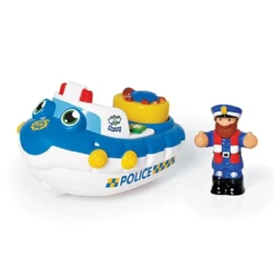 Push-button to squirt water from boat jets 2-piece set including 1 bath boat and 1 figure Removable policeman figure Mould-resistant, BPA Free, PVC Free, No Toxic Paint, No Small Parts, Manufacturer: WOW Toys