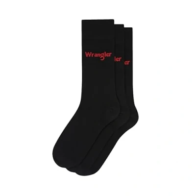 HIGH QUALITY FABRIC: This essential 3-pack of men's socks offers the perfect combination of comfort, durability, and style. Made from a blend of cotton, polyester and elastane, these crew socks ensure a soft and comfortable feel, whilst maintaining durability and stretch, making them perfect for everyday wear. CREW SOCKS: Featuring a classic crew length, these black socks are designed to stay in place throughout the day. The stay-put fabric ensures they won't slip down, providing both style and functionality for various occasions. Featuring the classic red Wrangler branding, these modern mens socks are an essential set, suitable for all. TEMPERATURE CONTROL: These mens work socks have moisture wicking properties, providing excellent breathability, helping to keep your feet cool and dry. These thermodynamic cotton socks are specially designed for all year wear, keeping your feet cool in summer and warm in winter. HARDWEARING: Designed with a double ply yarn, these mens sports socks can withstand regular use and repeated washing without losing their shape or comfort. The reinforced heel and toe areas add to their longevity, making them a reliable choice for daily wear. MULTIPACK: Each pack includes three pairs of black Wrangler socks, providing excellent value and convenience for daily wear. These mens black socks are machine washable, and the high-quality fabric is designed to retain its softness and colour. Note: *Do Not Bleach, Do Not Tumble Dry, Cool Iron, Do Not Dry Clean*.