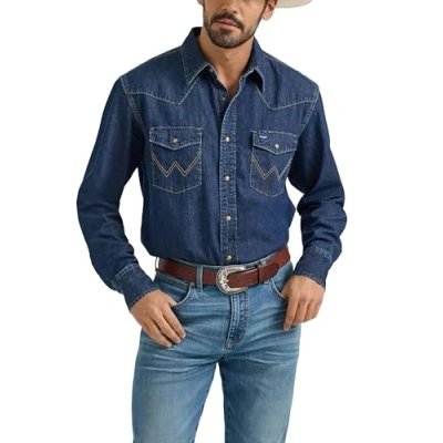 REGULAR FIT. Take any outfit to a whole new level with this denim shirt. Classic in every way, it's cut with a regular fit that's not too tight or too loose—just right whether you're wearing it on its own or layered over a tee. CLASSIC WESTERN STYLE. This western shirt is a tried and true classic. The timeless denim fabric adds durability, while authentic yokes, two-snap western cuffs, and classic snap pockets and closures add extra visual impact. SOFT FABRIC. This jean shirt is crafted from buttery soft and breathable cotton fabric to keep you feeling as good as you look. QUICK-ACCESS STORAGE. Designed with two snap-closure pockets on the chest, this long-sleeve button-down allows for quick access storage and added style. FUNCTIONAL DETAILS. This denim shirt comes with a snap front closure and snap cuffs for easy layering.
