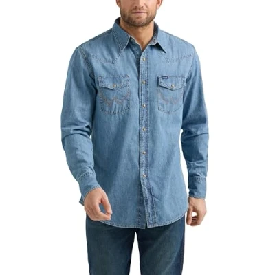 REGULAR FIT. Take any outfit to a whole new level with this denim shirt. Classic in every way, it's cut with a regular fit that's not too tight or too loose—just right whether you're wearing it on its own or layered over a tee. CLASSIC WESTERN STYLE. This western shirt is a tried and true classic. The timeless denim fabric adds durability, while authentic yokes, two-snap western cuffs, and classic snap pockets and closures add extra visual impact. SOFT FABRIC. This jean shirt is crafted from buttery soft and breathable cotton fabric to keep you feeling as good as you look. QUICK-ACCESS STORAGE. Designed with two snap-closure pockets on the chest, this long-sleeve button-down allows for quick access storage and added style. FUNCTIONAL DETAILS. This denim shirt comes with a snap front closure and snap cuffs for easy layering.