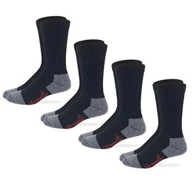 Steel toe boot socks are medium weight with rib leg for extra durability while working and outdoors Full cushion foot to provide added comfort and protection in boots Arch support forms to foot for optimal fit, support, and reduces foot fatigue Ringspun cotton with reinforced heel and toe for comfort and durability Four pair pack value is perfect for steel toe boots, work boots, outdoors, and everyday