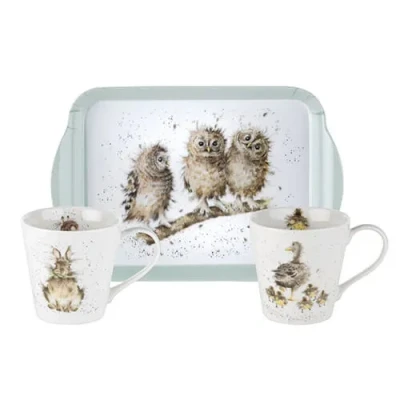 The Wrendale Designs Mug and Tray set features a small melamine tray and a pair of porcelain mugs.Featuring the beautiful illustrations of Hannah Dale, the tray has three owls on the front, one mug features a hare and the other features a duck.The mugs are dishwasher safe and suitable for warming contents in the microwave.Mug capacity 180ml.