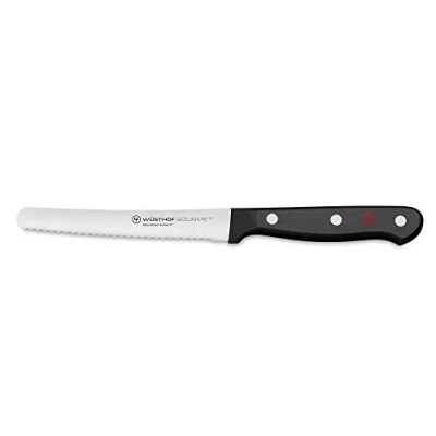 Amazon MarketplaceUTILITY KNIFE – The gourmet 4 1/2 inch serrated utility knife is smaller than a cook’s knife but larger than a paring knife, making it the perfect knife for magnitude of tasks, a utility knife is much like a versatile paring knife and is perfect for mincing shallots, onions and herbs as well as cutting vegetables or cutting small meats WÜSTHOF GOURMET SERIES – Precisely laser-cut stamped knives offer superb quality and value, Wüsthof gourmet cutlery is made with synthetic polypropylene handles that resist fading, discoloration, heat and impact RAZOR SHARP – High carbon stainless steel blades, precisely cut with the latest state of the art technology for incredible sharpness and easy maintenance, Wüsthof kitchen knives are hand wash only DURABLE – Cutlery is crafted to resist corrosion and dulling CENTURIES OF TRADITION – Family owned for seven generations, Wüsthof was founded in solingen, Germany over 200 years ago, Wüsthof’s cutlery cutlery carries the solingen name, a designation reserved for products that meet the strictest quality standards
