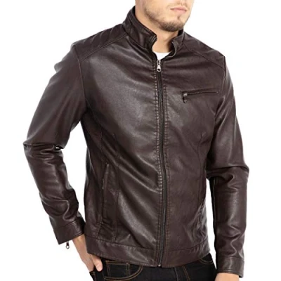 WULFUL Men's Stand Collar Leather Jacket Motorcycle Lightweight Faux Outwear, Coffee, Large
