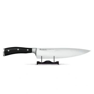 To maintain the exceptional quality of the Wüsthof Classic Ikon Chef's Knife, it is recommended to hand wash with mild soap and warm water, as using a dishwasher can compromise the knife’s longevity. Regular sharpening with a whetstone or sharpening steel is advisable to keep the edge in pristine condition. Storing the knife in a block or on a magnetic strip is ideal to protect the cutting edge and ensure safe storage. Additionally, using a soft cutting board will help maintain the blade's sharpness, as cutting on hard surfaces such as metal or glass should be avoided.