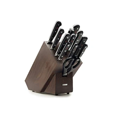 AmazonKNIFE SET – Includes 3 inch paring knife, 4 inch paring knife, 5 inch serrated utility knife, 5 inch boning knife, 6 inch cleaver, 7 inch santoku, 8 inch chef’s knife, 9 inch bread knife, 9 inch utility knife, 6 inch meat fork, 9 inch honing steel, come-apart kitchen shears WÜSTHOF CLASSIC SERIES – The full tang, triple riveted handles of the classic line offer the widest range of cutlery that can satisfy every home cook or professional chef, the Wüsthof classic series has been our best-selling series for generations RAZOR SHARP – High carbon stainless steel blades, precisely cut with the latest state of the art technology for incredible sharpness and easy maintenance, Wüsthof kitchen knives are hand wash only PRECISION FORGED – Forged from a single block of high carbon stainless steel and tempered to 58-degree HRC, the precision edge technology (PEtec) yields a blade that is 20 percent sharper with twice the edge retention than previous models, Wüsthof classic series knives feature a full bolster and finger guard CENTURIES OF TRADITION – Family owned for seven generations, Wüsthof was founded in solingen, Germany over 200 years ago, Wüsthof’s cutlery cutlery carries the solingen name, a designation reserved for products that meet the strictest quality standards
