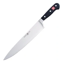 MegacookingworldThe Wüsthof Classic Chef's Knife 26 cm is an indispensable all-rounder for every home chef. Whether you are cutting meat, fish, vegetables or herbs, this knife offers unparalleled precision and ease. A perfectly balanced knife that combines craftsmanship and functionality, designed to handle any cutting task with ease. This edition of the Classic series stands out with its stainless steel rivets and seamless finish. Despite its simple appearance, the knife has been developed as a robust workhorse that can handle any challenge. Unique features and specifications * Blade Finish: Brushed * Forged: This means that the knife is hammered from a single piece of steel. This ensures that the knife is forged with more time and attention, so that the knife is finished with precision. In this process, innovative technologies are combined with centuries-old traditions of handmade craftsmanship. This Wüsthof knife is 20% sharper than your average knife, thanks to laser-guided sharpening processes. * Razor-sharp masterpiece : This knife is razor-sharp, thanks to the craftsmanship of Wüsthof. With this knife you can effortlessly and precisely cut through vegetables or meat. This knife can be sharpened at a razor-sharp angle of 14 degrees due to its hardness of 58. * Grinding method: European * Country of origin: Germany, Solingen * Balance and ergonomics : This chef's knife fits perfectly in the hand thanks to its balanced design. For both left- and right-handed people. * Steel type : Made of high-quality X50CrMoV15 steel. Also called WÜSTHOF steel, which has a patented mix of German steel. This knife has an optimal formula for durability. * Warranty : We are fully convinced of the quality of Wüsthof kitchen knives. That is why we offer a lifetime warranty on material and manufacturing defects! Maintenance and recommendations * Hand wash with mild soap and warm water, avoid the dishwasher. * Sharpen regularly with a whetstone or sharpening steel to maintain sharpness. * Store in a knife block to protect the cutting edge. * Use a soft cutting board to keep the blade sharp and protect it. Ready to make your culinary dreams come true? Order your new chef's knife now!