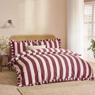 ELEGANT DESIGN: Bring timeless British heritage charm into your bedroom with the delicate ruffle trim and classic stripes on both sides. COMFORTABLE FABRIC: Made from cotton-rich fabric with a 180 thread count for a soft, cosy feel that’s perfect for a restful night’s sleep. VERSATILE REVERSIBLE STYLE: Featuring stripes on both sides, this duvet cover set lets you easily switch up your décor whenever you fancy. PRACTICAL AND EASY CARE: Fully machine washable, so you can keep your bedding fresh and beautiful with minimal effort. BOLD YET SUBTLE: Designed to be a standout piece with on-trend cottagecore vibes, creating a serene and stylish retreat in any bedroom.