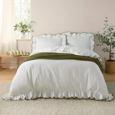 DELICATE RUFFLE DETAIL: Subtle ruffled trim adds a gentle, elegant flourish that brings quiet charm to your bedroom decor. SOFT COTTON SATEEN: Made from 100% cotton sateen, offering a luxuriously smooth and comforting touch against the skin. LIGHT AND BREATHABLE: 180 thread count ensures a soft yet durable finish, perfect for restful and cosy nights. REFINED PIPED TRIM: Finished with a delicate piped border, providing a sophisticated accent that complements the frill detailing. UNDERSTATED ELEGANCE: A semi-plain design evokes calm and timeless style, effortlessly enhancing any modern or cottagecore-inspired space.