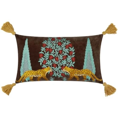 Embroidered leopards add a touch of the wild. Tassel trims complete the maximalist look. Crafted from 100% cotton velvet for luxury.