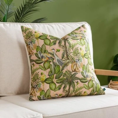 Featuring tropical wildlife perched amongst the jungle florals, set against a Mediterranean-inspired block print pattern. Complete with a linen-look reverse, standard knife edging and hidden zip fastening. Made of 100% polyester fabric, this cushion is super soft, yet durable. Designed, printed and made in the UK. Machine Washable (40 degrees max), Line Dry and Cool Iron Only.