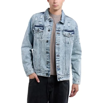 X RAY Mens Denim Jacket Ripped Casual Trucker Distressed Jean for Men Blue Large