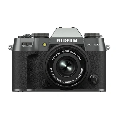 The Fujifilm X-T50 has some good genes. It's inherited the classic film camera looks of the X-T series, including traditional control dials for tweaking settings on the fly. You've got 40-megapixels to play with which is ideal for poster prints or deep cropping. Inspired by film, the X-Trans CMOS 5 HR processor cleverly boosts resolution while keeping noise in a minimum. It's super speedy too with the X-Processor 5 on board. It's twice as fast as the previous-gen processor without being power hungry, so it won't eat up your battery life. And with up to 7 stops of in-body image stabilisation (IBIS), images and video look sharp, even in dim lighting.Good to know- Tricky subjects like animals and vehicles are kept sharply in focus with subject-detection AF with AI technology- Mix it up with 20 modes on the film simulation dial, including favourites like Astia and Velvia- Shoot from the hip with the tilting LCD screen - or use the electronic viewfinder on sunny days- Not just for stills - you can shoot 6.2K movies (up to 30 fps in 4:2:2 10-bit colour) that are packed with rich colours and detail- F-Log2 support has a dynamic range of over 13 stops for more wiggle room post-processing- The included 15-45 mm zoom lens has optical stabilisation, so it's great for handheld videos and group shots