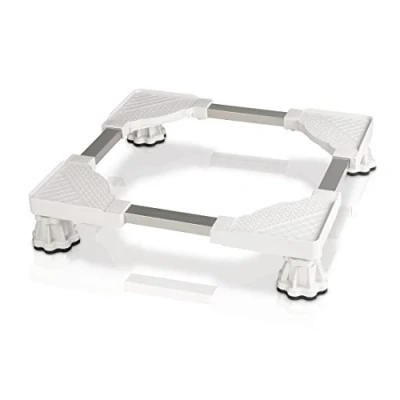Stable heavy-duty base frame: raiser for washing machine and dryer with height-adjustable feet (13-18 cm), ergonomic and back-friendly Extendable rails: width and length individually adjustable from 52 to 72 cm, also suitable for freezers, refrigerators, furniture or transport boxes Feet with rubber attachments: for a firm stand without slipping and as a vibration damper that reduces vibrations and protects the floor from scratches Practical base: protects the washing machine and tumble dryer from floor moisture and makes cleaning easier, does not need to be moved away Box contents: 1 x washing machine base with 150 kg load capacity, 1 x instruction manual (English language not guaranteed)