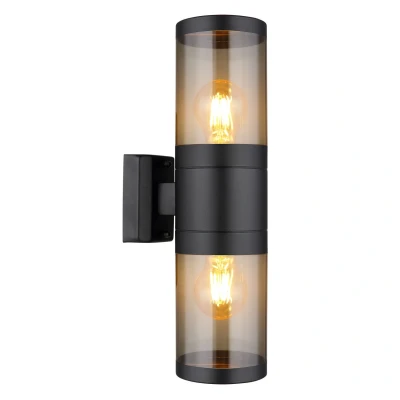 This great wall lamp inspires with its modern design. A cylindrical housing with smoky glass and two E27 sockets, which are positioned upwards and downwards, protrude from a rectangular wall mount. The E27 sockets allow you to determine your own light colour and brightness up to a maximum power of 60 watts. Due to durability and energy savings, we recommend LED bulbs. Product features: Outdoor light stainless steel black matt, plastic smoke colored, light shine direction: up and down, ip44, wxh: 102x380mm, al: 155mm, excl. 2x e27 60w 230v