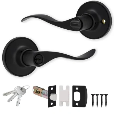 XFORT Cabriole Entrance Knob Set Matt Black, Door with Lock for Internal Wooden Doors, Complete Tubular Latch and 3 Keys