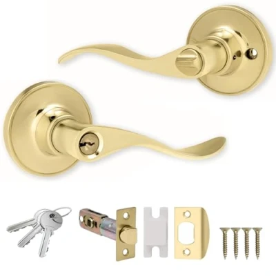 XFORT Cabriole Entrance Knob Set Polished Brass, Door with Lock for Internal Wooden Doors, Complete Tubular Latch and 3 Keys