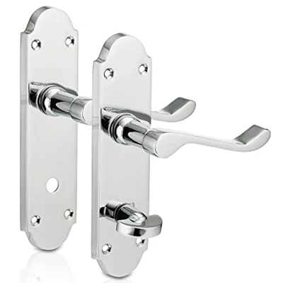 FEATURES: These XFORT Richmond bathroom door handles internal are a popular choice, suitable for any bathroom of the house or office. They have a modern design with an elegant touch. The handles automatically return to the horizontal position due to an integrated spring mechanism. The sliding mechanism is fitted with a nylon seal to provide ingress protection. APPLICATION: These handles provide latching for internal doors where privacy locking is required. They are used with a bathroom door lock (not supplied) to allow opening and closing of the doors and a thumb operated locking mechanism. This ensures locking of the door whilst inside the toilet/restroom, preventing unwanted access. They are suitable for all types of indoor bathroom wooden doors. SIZE & FINISH: The finish is pristine polished chrome, which gives a stylish look that will complement any interior décor. The handles are made from zinc and finished with multi layered chrome plating to ensure strength and durability. Please refer to the images for detailed product dimensions. EASY INSTALLATION: Fixing the XFORT bathroom handles merely involves screwing each handle to the sides of the internal door with the fixings supplied. They are ideal for new doors or as replacement door handles. FIXTURES & FITTINGS: All the necessary fixtures are supplied including the fixing screws and internal handle bar. The mortice bathroom locks (B073HK7Z8B) are not supplied but can be ordered from the Amazon website separately using the code provided. The spindle can be cut to size according to your liking for ease of installation., Manufacturer: Maher London Ltd