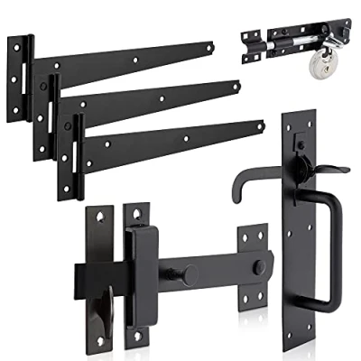 XFORT Suffolk Gate Latch Pack Black Complete with Three T Hinges (300mm), One Brenton Bolt (6 inch) and Discus Padlock (60mm), Kit for Hanging Garden Door, Fitting